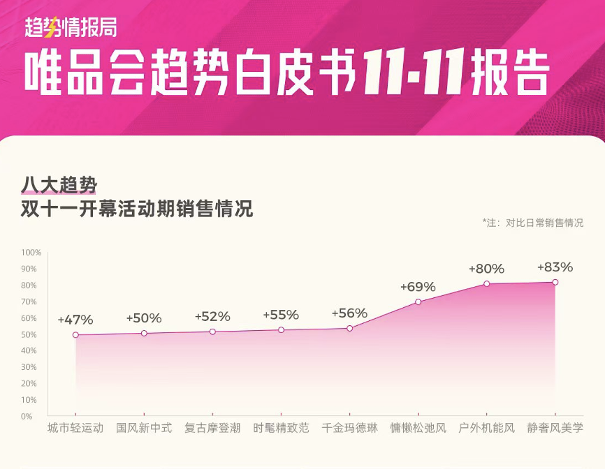正值“双十一”活动期间,唯品会在进博会上首次发布《唯品会趋势白皮书11·11报告》。报告显示,城市轻运动、时髦精致范、户外机能风等潮流趋势热度攀升,相关商品销售快速增长。