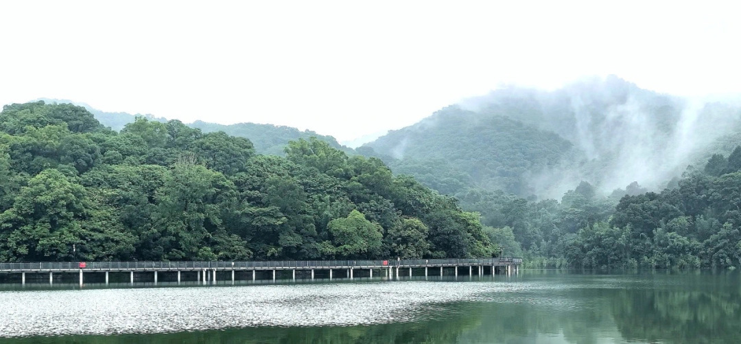 从白云山林间幽径走下几级台阶,便来到黄婆洞水库亲水栈道,栈道环绕着黄婆洞水库而建,宽3.5米,在上面徒步就像面对一个大氧吧,游客可以近距离环湖亲水游览,是绝佳的观山、观鸟、观林的景观节点。
