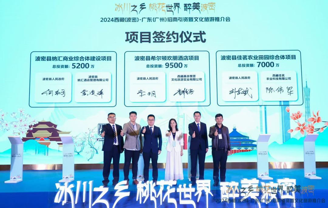 11月6日下午,2024西藏(波密)-广东(广州)招商引资暨文化旅游推介会在广州召开。记者从活动现场了解到,共有3个招商引资项目达成签约,涉及酒店、农业田园综合体、商业综合体等多个建设项目,签约投资金额共计2.17亿元。