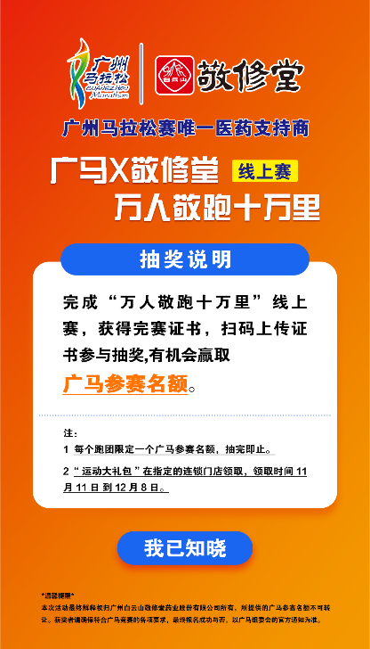 即日起,前往与白云山敬修堂合作的十六家连锁大药房线下门店,扫码加入当地连锁跑团参加白云山敬修堂“万人敬跑十万里”活动,通过使用“第一赛道APP”累计完成8公里跑步打卡,即成功参与活动并获得电子完赛证书。凭完赛证书参与抽奖,有机会获得2024广马参赛名额或运动大礼包,100%中奖!