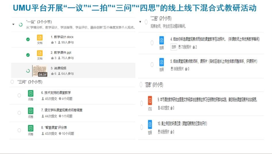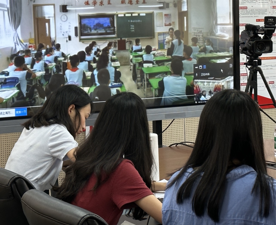 此外,学校借助线上平台开展线上线下混合式教研。以往,校内的教学管理人员往往要到课堂实地评课,听上一整堂课,才能给出课堂改进评价。如今,老师们可在录制课堂视频后上传至系统,或开展课堂直播,在线上互相评课,大大提高听课评课效率。目前,该校教师基于某平台开展观课研讨活动,同步向全国各地的结对学校开展直播辐射和线上互动,至今共开展线上线下混合式教研课程486个,对外直播的精品课有48节,直播观看人数达122095人次。