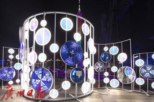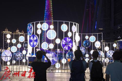 位于花城广场南广场的灯光节作品《融光》正在亮灯调试中。