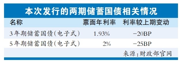 记者留意到,本次两期储蓄国债利率均再次下调,其中3年期产品票面年利率较上期下调后跌破2%,票面年利率仅1.93%;5年期产品票面年利率较上期下调至2%。按照票面利率计算,投资者如果购买10万元本次发行的3年期、5年期储蓄国债,累计收益分别为5790元和10000元。