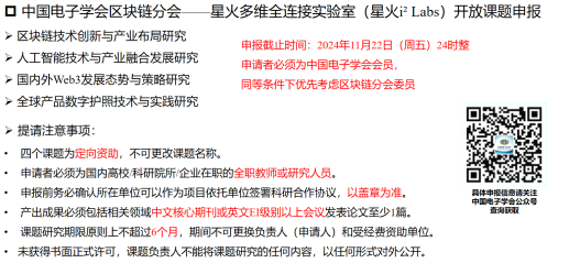 大会发布了中国电子学会区块链分会与星火多维全连接实验室(星火i² Labs)联合设立的4个开放课题,包括:区块链技术创新与产业布局研究、人工智能技术与产业融合发展研究、国内外Web3发展态势与策略研究、全球产品数字护照技术与实践研究,面向国内高校、科研院所、企业的相关研究人员开放申报,并设有课题资助经费。