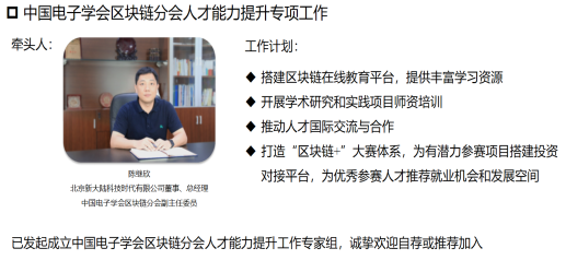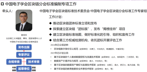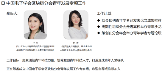 新一代信息技术产业研究院执行院长、中国电子学会区块链分会总干事李颋对分会目前正在推进的三大专项工作进行了系统介绍,每项工作均由分会的委员专家进行牵头。在标准编制方面,计划探索“团标簇”,建立标准地图,开展标准评估,重点围绕数字身份互认、个人敏感数据授权与流通、数据资产价值评估、数据资产确认与追溯、教育数据安全共享等方面开展工作。在人才能力提升方面,计划开展在职人员培训和继续教育、学术研究和实践项目师资培训、“区块链+”大赛等工作。在青年发展方面,计划开展青年学者顶会顶刊成果推荐和高校青年沙龙交流分享工作。接下来,区块链分会还将结合所在专业领域前沿态势和委员自身发展需要,争取在科技评价、产业对接、国际合作等方面,开展更多特色突出、行之有效的专项工作。