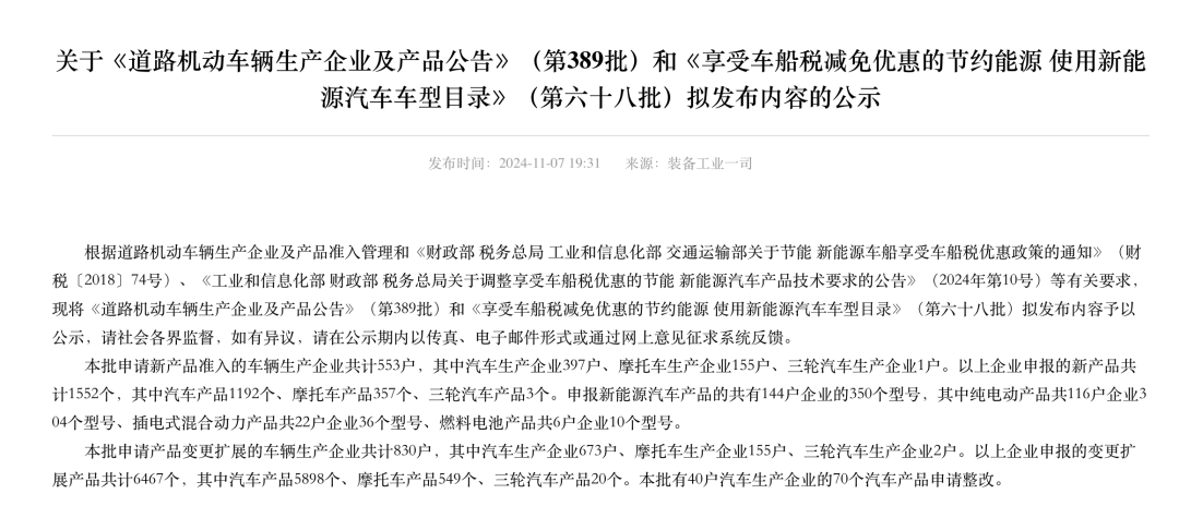 11月7日,工信部装备工业一司公示《道路机动车辆生产企业及产品公告》(第389批)和《享受车船税减免优惠的节约能源 使用新能源汽车车型目录》(第六十八批)拟发布内容。