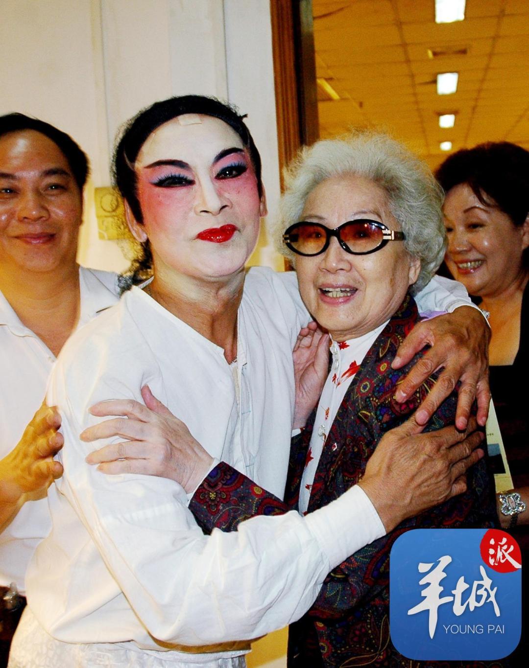 2006年8月20日,红线女(右二)亲临剧场为陈晓明(左二)打气(梁彦兰 摄)
