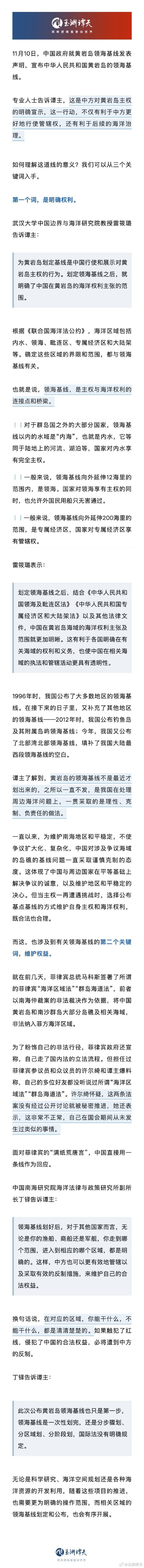 3. 此次公布黄岩岛领海基线只是第一步,后续,随着科学研究、海洋空间规划等项目的推进,相关区域的领海基线划定和公布也会有序开展。