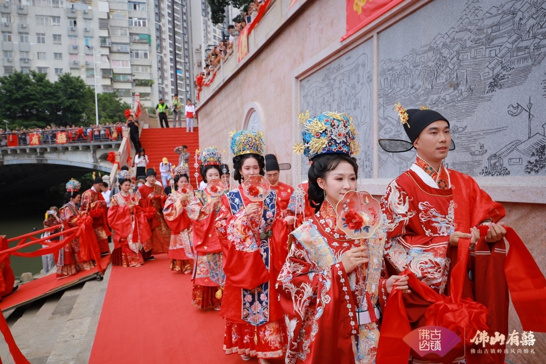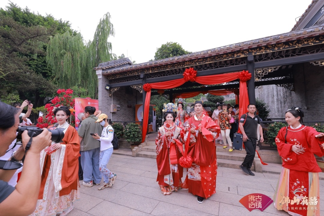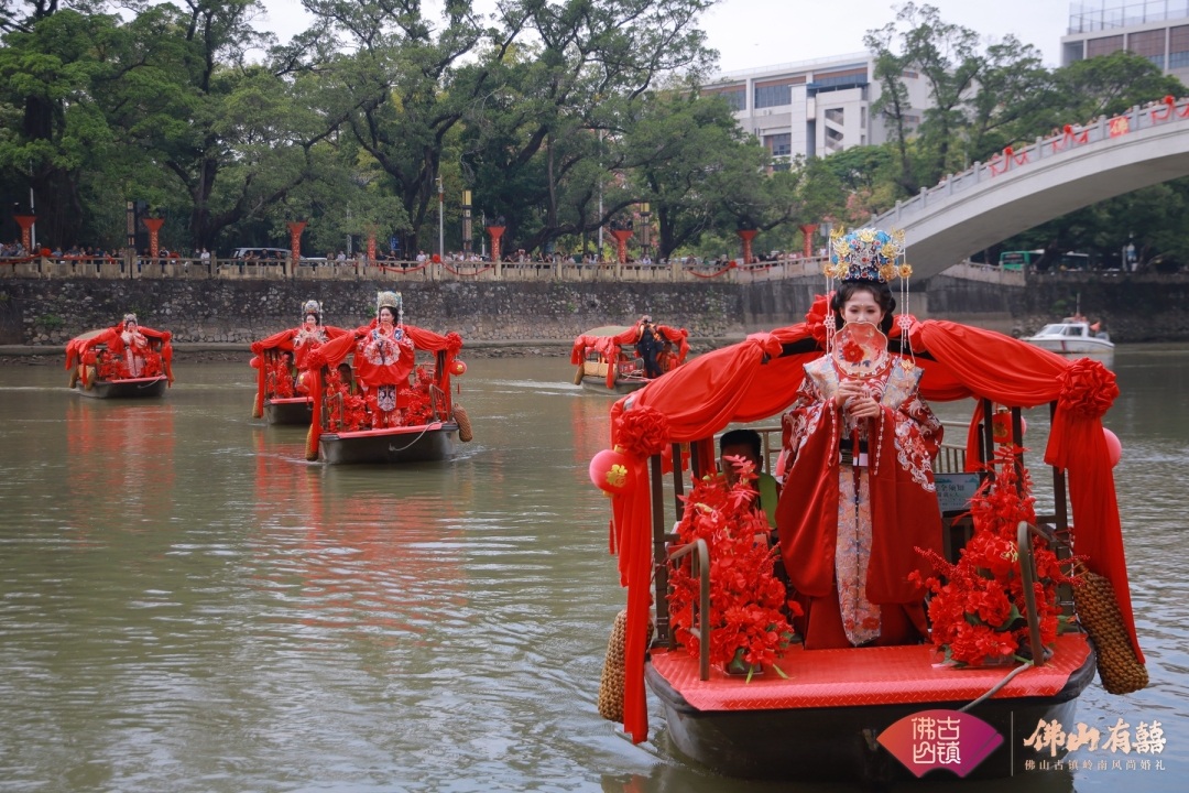 鼓乐齐鸣,锣鼓喧天。新娘乘坐花轿,新郎在旁相伴而行,沿古道穿梭佛山古镇,先后经过琼花会馆、忠义乡牌坊、永安路、国瑞汾宁古道、富民路、松风路等佛山古镇的历史街区,最后到达梁园,进行内堂传统仪式。