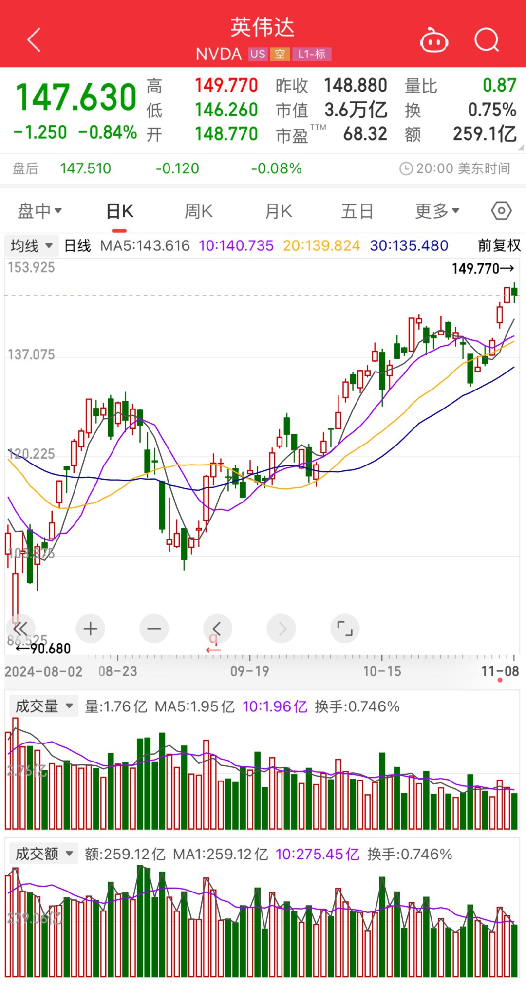 当地时间11月8日美股收盘,英伟达股价报147.63美元/股,尽管股价下跌0.84%,但其总市值依然达到3.62万亿美元。截至当日收盘,苹果公司股价为226.96美元/股,总市值为3.43万亿美元;而另一家科技企业微软公司的股价为422.54美元/股,下跌0.68%,总市值为3.14万亿美元。两家公司的总市值均低于英伟达。