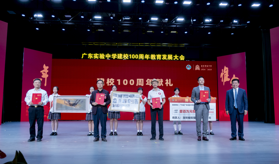还有教师校友积极为学校百年华诞献礼。其中,省实老教师罗易捐赠了《春秋罐》,校友陈铿捐赠绘制油画《追光》,校友杨小辉赠予母校《四代省实人合影集》,校友李天驰代表深圳编程猫科技有限公司向省实基金会捐赠了100万元。1968届校友杨小辉介绍,1958年他作为“十年一贯制”学制改革后的首批学生入读省实,学校严格要求学生认真学习、踏实做人,自己深受影响,对母校感情深厚。1925年至今,杨小辉家四代九口人在省实读书求学,他赠予学校的合影集里充满了“省实记忆”。