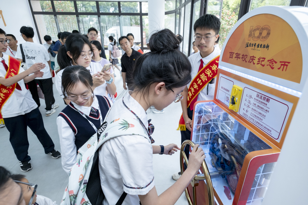 活动当天,省实校史馆在荔湾校区正式揭幕。校史馆全面回顾了省实的办学历程,从立教开津、启智报国,到多年来的以质立校、锐势发展,再到学校为国家和社会培育出大批优秀人才,向公众生动展示了省实砺变与革新的澎湃历程。校史馆内的一棵仿真树,创意源于位于省实越秀校区操场东北角的古榕,其有着独特的“心”形树冠,恰似“省实之心”,承载着许多省实校友的美好青春记忆。校史馆成了活动当天热门“打卡”点之一,众多校友排队体验纪念币制作。