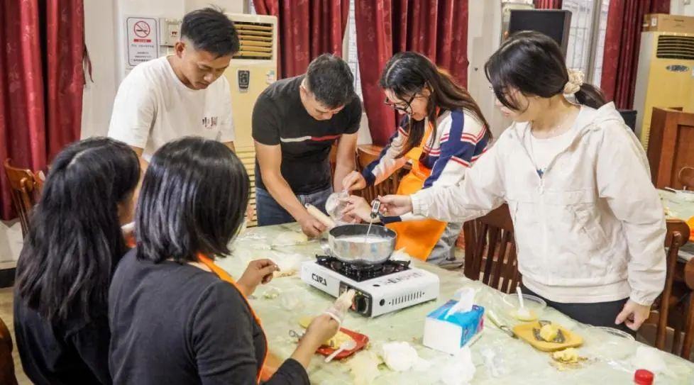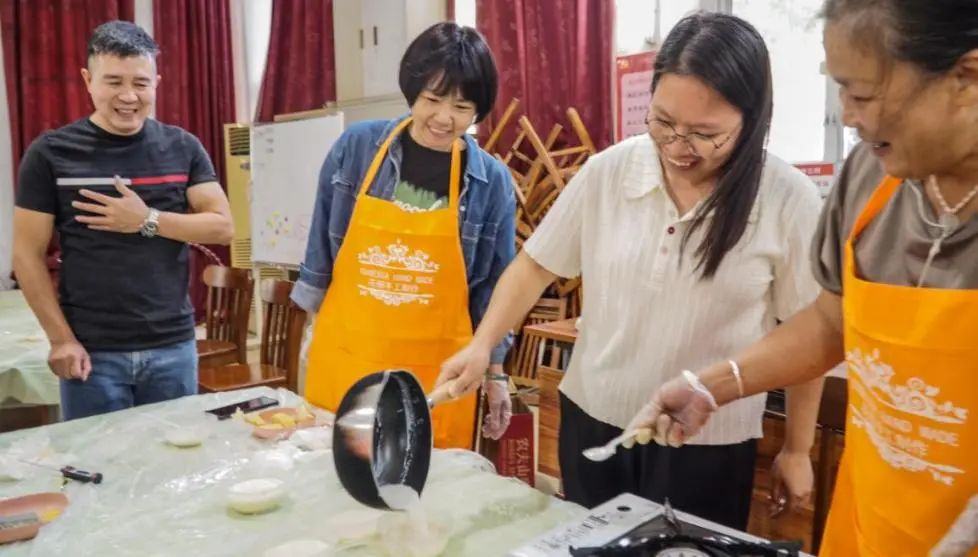 老师现场演示了姜汁的制作过程,以及牛奶冲撞姜汁的技巧。在等待姜撞奶凝固的过程中,村民们热情高涨,大家互相帮助,分享姜汁,展开了热烈的讨论,交流制作心得。这种互动不仅增进了村民之间的友谊,也使活动充满了浓厚的生活气息。