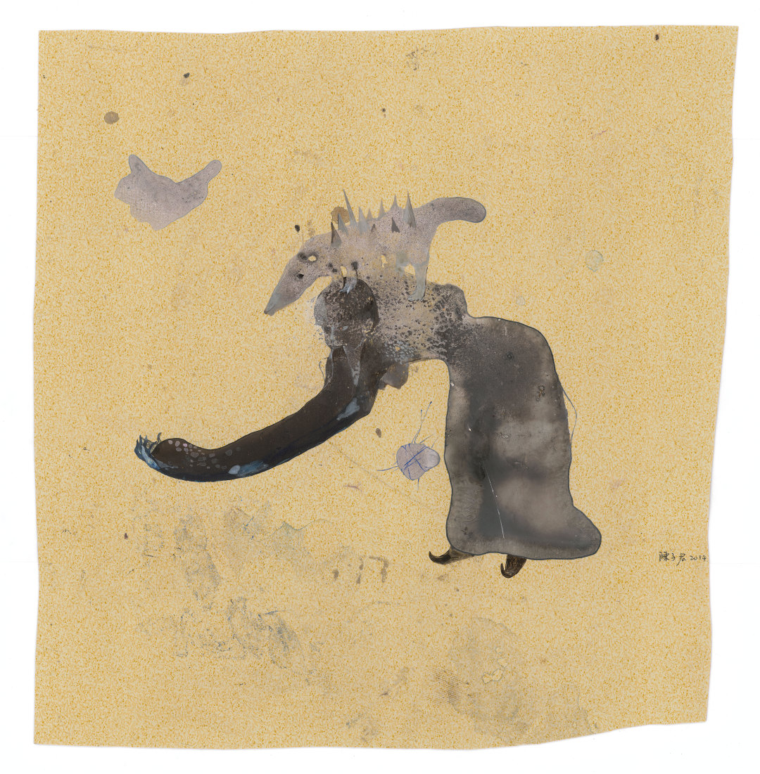 再往前追溯,就看到2014年始,陈子君已经在思考“精灵”的论题。她发现自己画画时滴洒在画室地板胶上的痕迹,其中有天真之象。这让人想起北京画院藏齐白石的一件纸本墨笔画《真有天然之趣》。齐白石在题跋上记录他1919年在北京法源寺闲话时,忽见地上砖纹有磨石印的石浆,色白如一只鸟儿,便就地取纸画存其草,认为其“真有天然之趣”。陈子君亦有此感,于2014年将地板胶割成碎片创作了“精灵”系列作品,并通过布偶的形式在2018年将之立体化呈现。“精灵”系列,成为陈子君“万物生长”系列的源起,并最终指向了《走出2022》的创作主题。