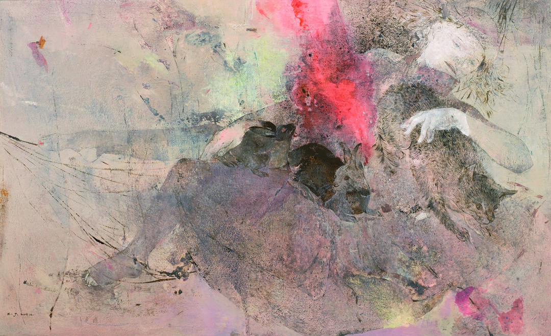 甚至在2010年前后,陈子君绘画中的动物形象有着和女孩等量齐观的空间位置,甚至在一些画面中成为视觉的核心。或者说,这是一个女孩逐渐失位,而动物形象逐渐凸显的过程。这也就意味着,在陈子君的生命意识里,内在的隐匿的心象才是艺术表达的核心,而现实生活的表象只能说是第二位的,并且变得越来越不重要。也就不难理解,2010年前后,陈子君创作了《惊梦》《动静》《暗涌》《序幕》等作品,从现实到梦境、从到表象到心象、从欢喜到疏离,陈子君在创作意识上越来越依赖其内在的感知,精灵的概念也就呼之欲出了。