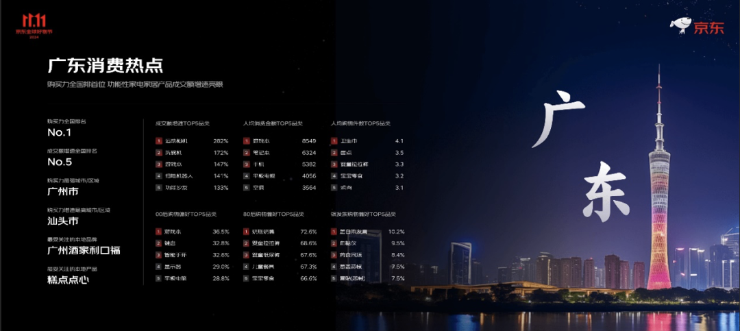 11月11日23点59分,一年一度的双11顺利收官,京东发布全国多地消费趋势。根据京东11.11消费情况显示,广东在此次大促期间表现亮眼,持续成为购买力全国排名第一的省份,成交额增速也表现不俗,位居全国第5名,同时,功能性的家电家居产品备受广东消费者的青睐。在广东省内,广州市是购买力最强的城市,购买力增速最高的城市则是汕头市。