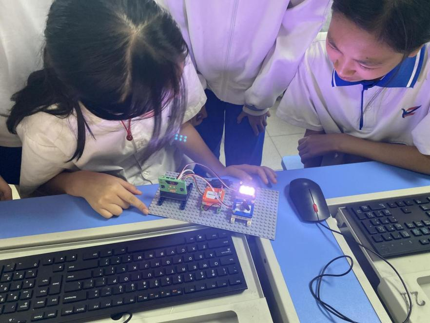 同学们正在上人工智能课,这节课的内容是《智能台灯》。同学们在老师指导下,尝试用声音控制电灯开关。
