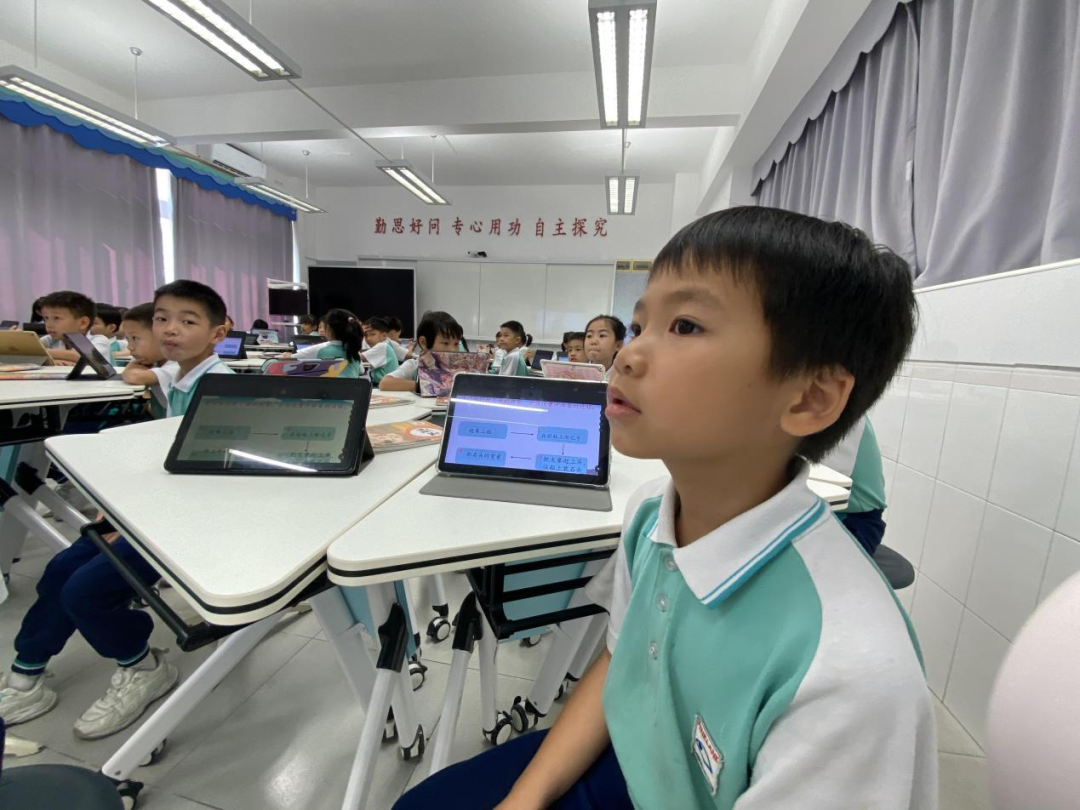 在方圆实验小学的课堂上,同学们正使用平板,学习《曹冲称象》一课。