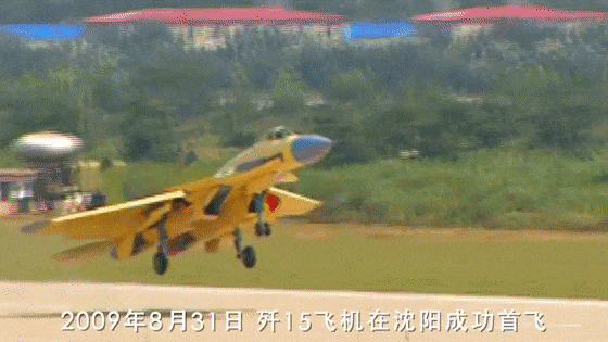 2009年8月31日,歼-15首飞试飞员李国恩驾驶战机升空,飞行13分钟后安全着陆。飞机刹停后,放下拦阻钩并进行机翼折叠。我国自主研制的歼-15舰载战斗机,顺利实现了陆基首飞。