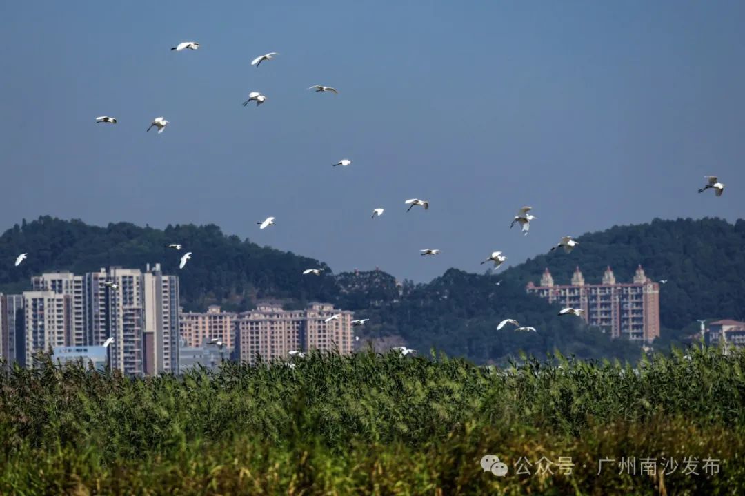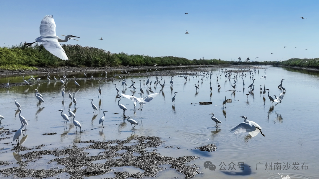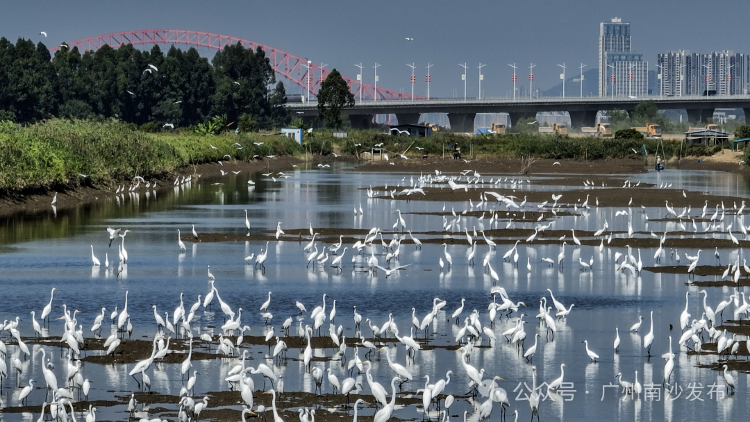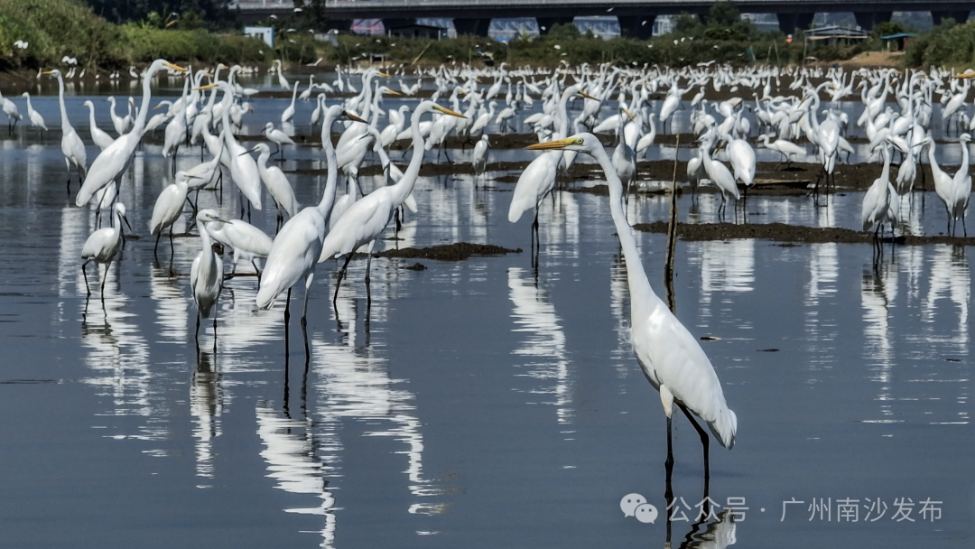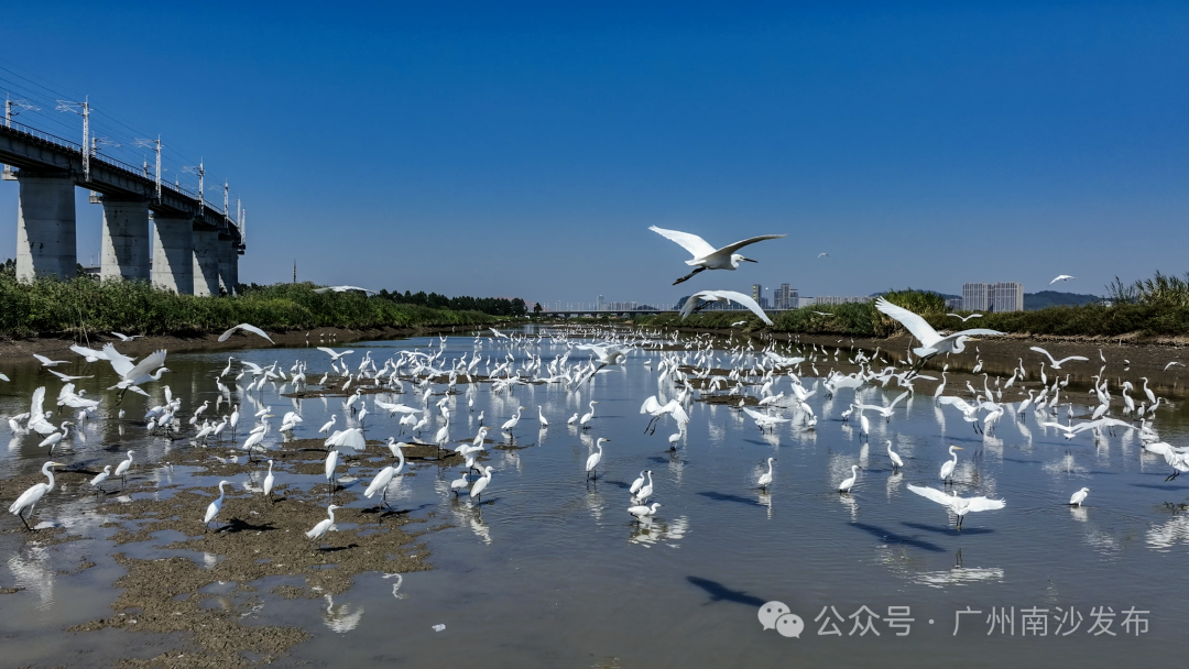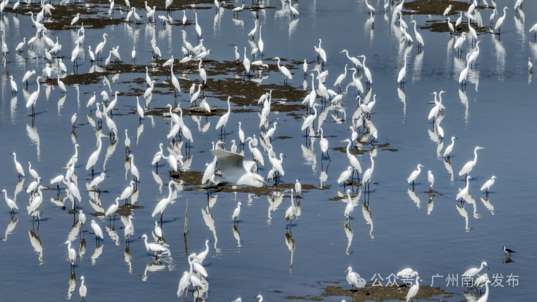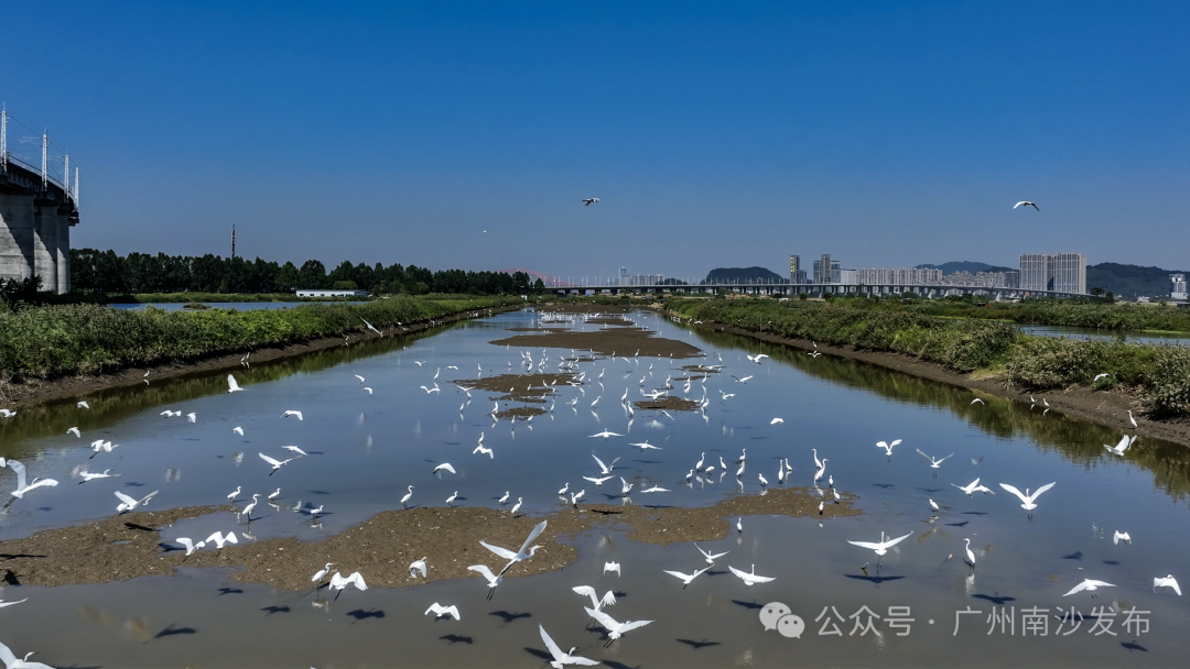 在南沙区龙穴大道二涌桥附近,近千只不同品种的白鹭以及反嘴鹬、白琵鹭等多种珍稀鸟类纷纷南迁至此。