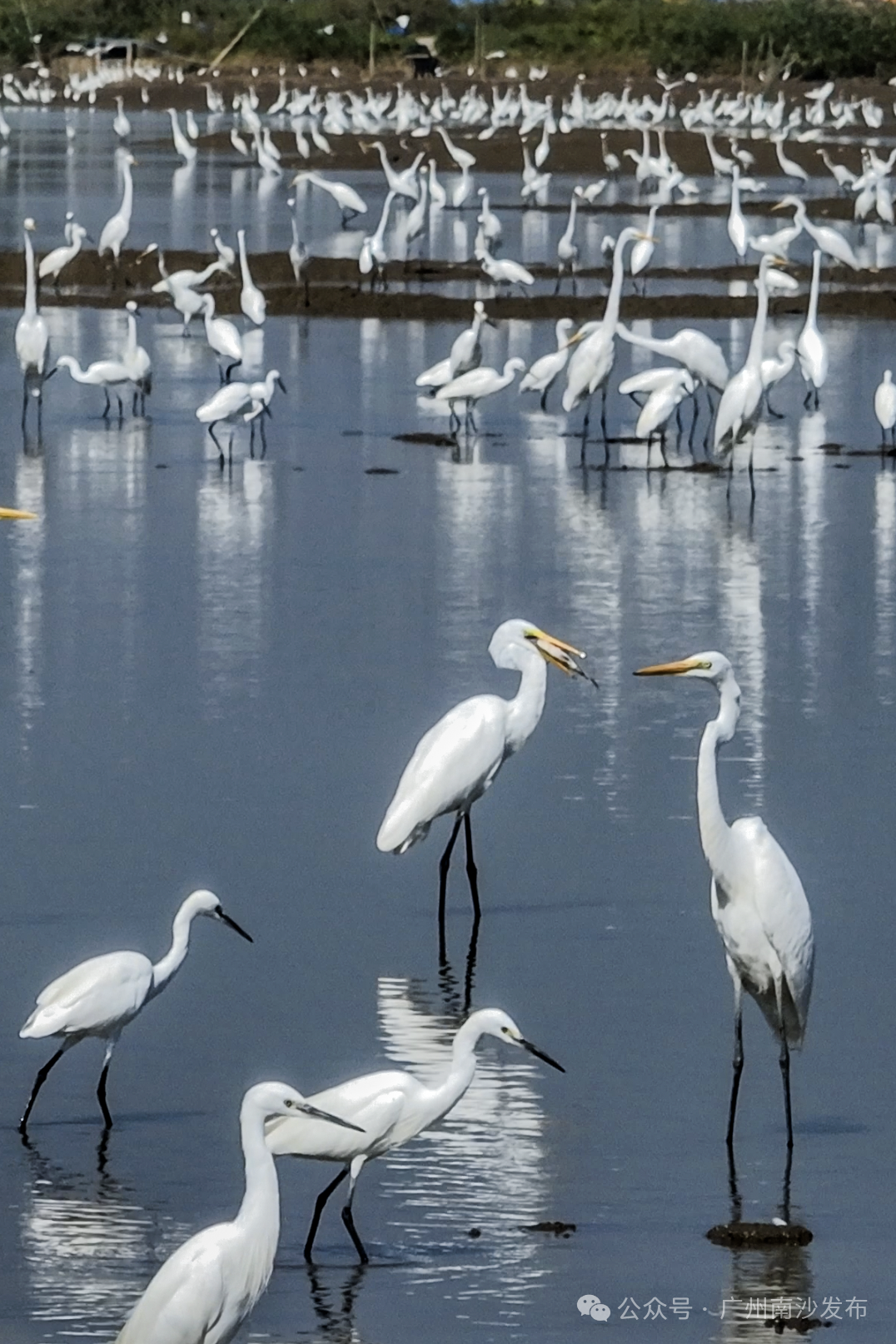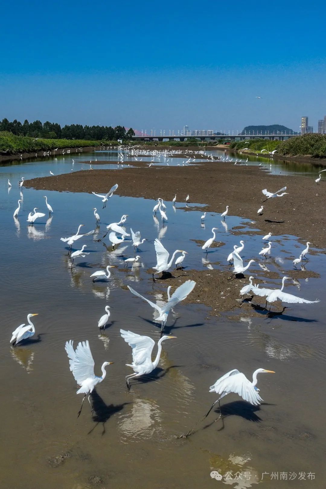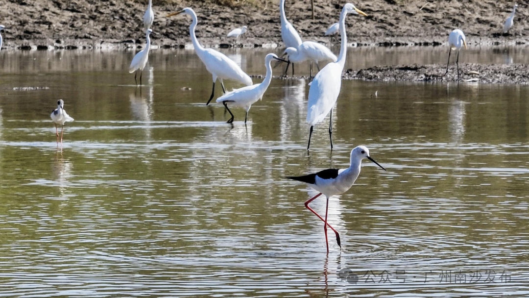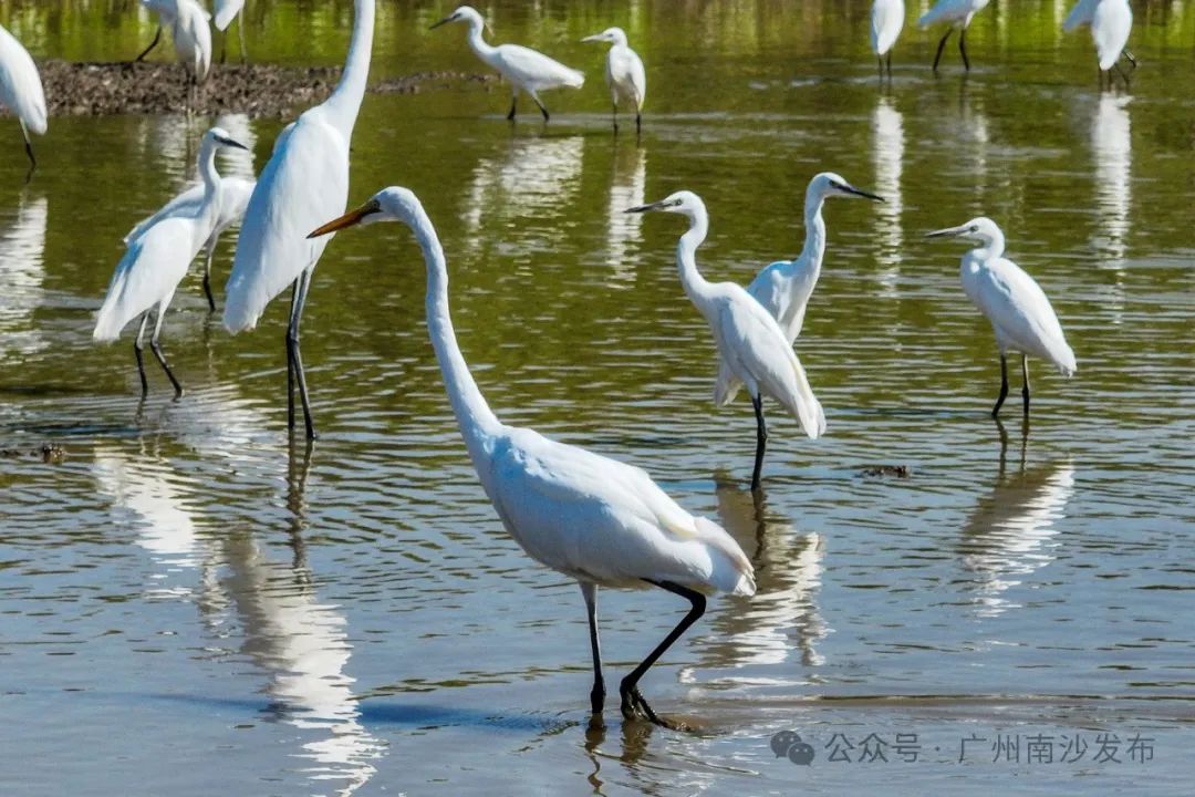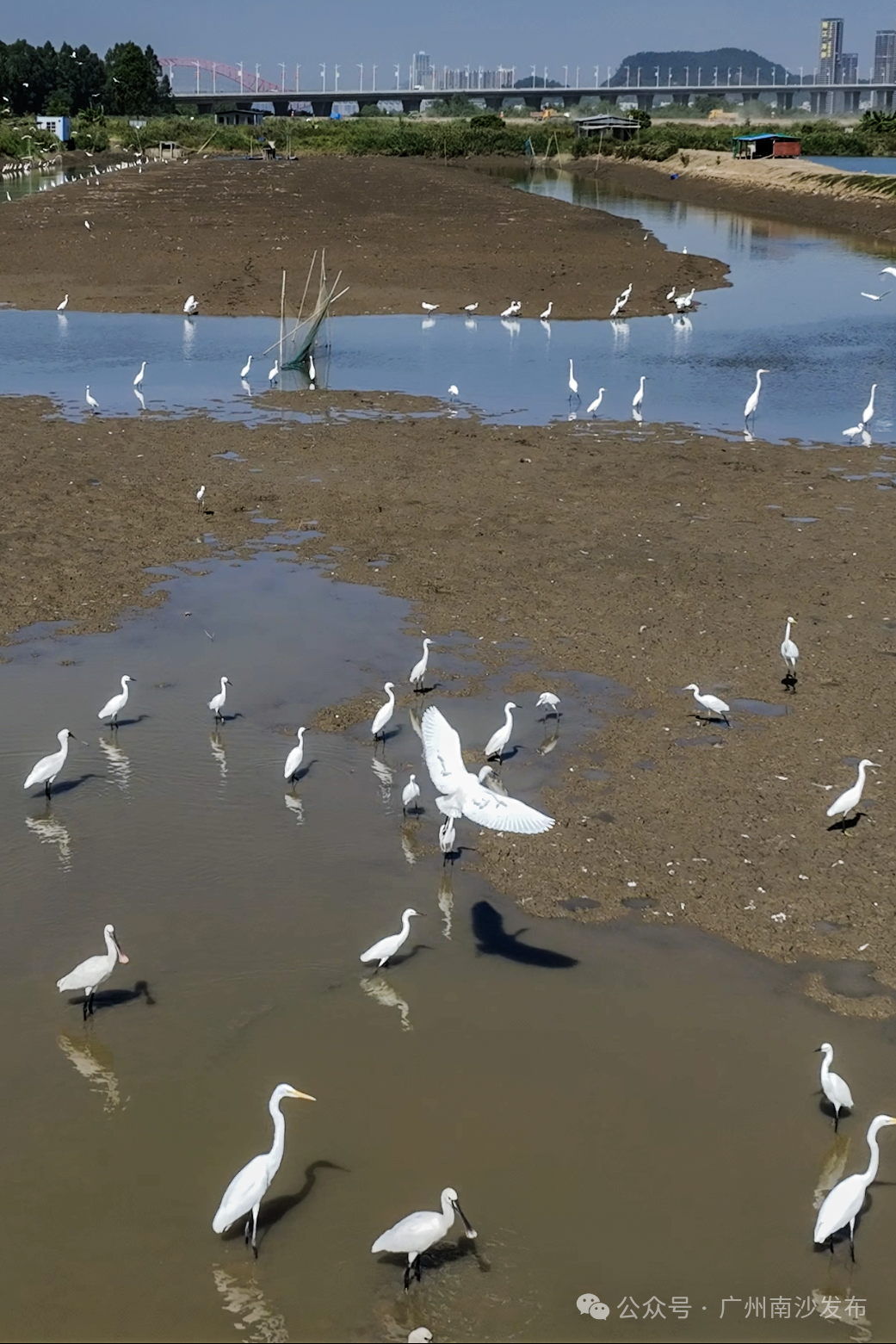 在南沙区龙穴大道二涌桥附近,近千只不同品种的白鹭以及反嘴鹬、白琵鹭等多种珍稀鸟类纷纷南迁至此。