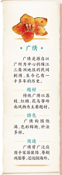 广绣与潮绣合称“粤绣”,距今已有一千多年历史,与苏绣、湘绣、蜀绣并列为中国“四大名绣”。传统广绣既具有浓郁的岭南风味,又吸收了西方艺术风格,一度引领时尚。2006年,广绣被列入第一批国家级非物质文化遗产代表性项目名录。