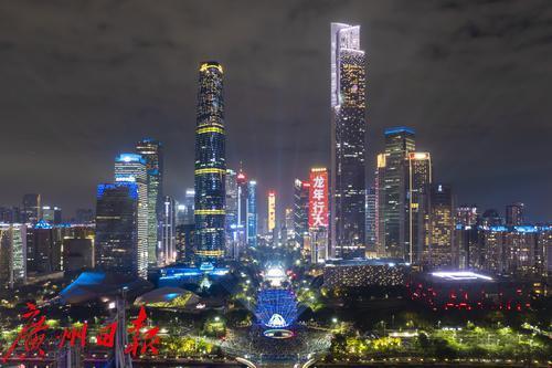 花城广场上的灯光节作品《融光》联动广州塔灯光进行灯光秀表演。