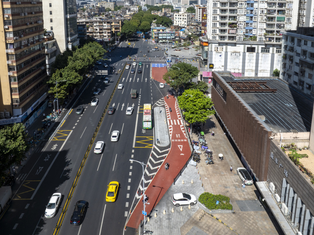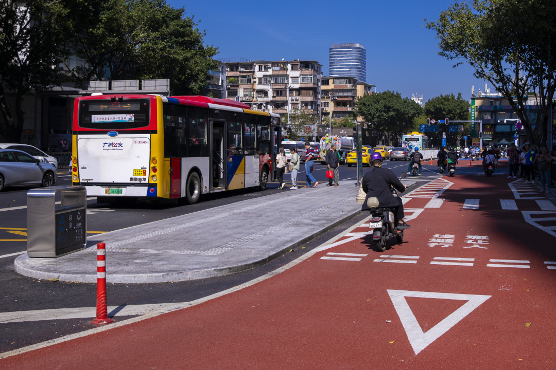 “针对公交站台区域的非机动车道,我们采取后绕式设置,即将非机动车道设置在公交站台的后方。”广州交警解释说,非机动车道采用红色涂料铺设,以醒目区分站台、非机动车道、人行道。交警部门还同步打通人行道路面的高低差,通过标线规范公交站台区域慢行系统通行条件,充分利用路口道路资源,避免了路口车辆违停违法行为的发生,有效提升路口的安全性。