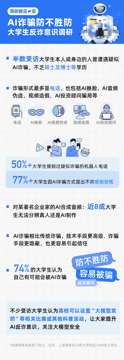 该调查样本选取了四川、北京、上海等地近10所大学的近1500名大学生。数据显示,半数的受访大学生本人或身边的人曾遭遇疑似AI诈骗,其中不乏硕士及博士等学历的学生。诈骗形式最多的是电话,同时也包括AI换脸、AI音频伪造、视频造假、AI投资顾问骗局等,其中一半以上受访大学生,表示接到过疑似诈骗的机器人电话。高达77%的受访大学生会因为AI诈骗方式层出不穷感到恐慌。