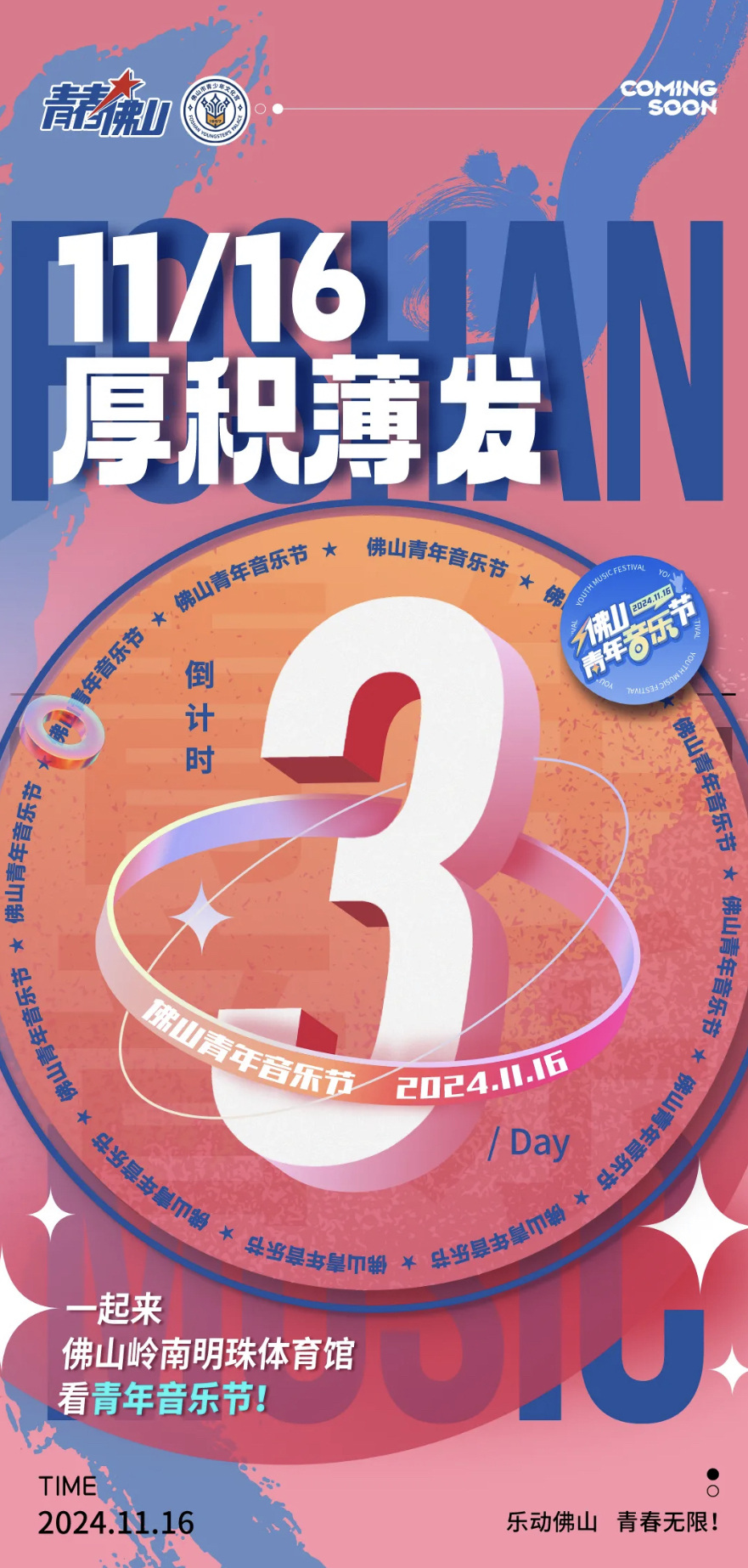 值得一提的是,为了让青年享受到更多福利,音乐节准备了10份艺人签名海报,在音乐节当日进行现场抽奖。主办方希望,以音乐为媒,搭建起青年与城市的沟通桥梁,展现佛山青年的蓬勃朝气与城市的无限活力。