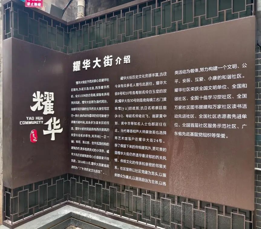 耀华大街雅静清幽,古风古韵,时间赋予了老街巷厚重的人文气息。众多名人曾在此居住,包括抗日名将蔡廷锴、粤剧名伶白玉堂、南海横江名门黄咏雩、画家黄中如、黄中羊等知名人士。他们都为这片土地留下了宝贵的文化财富。