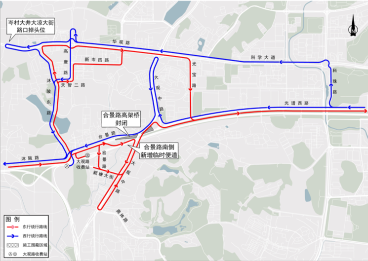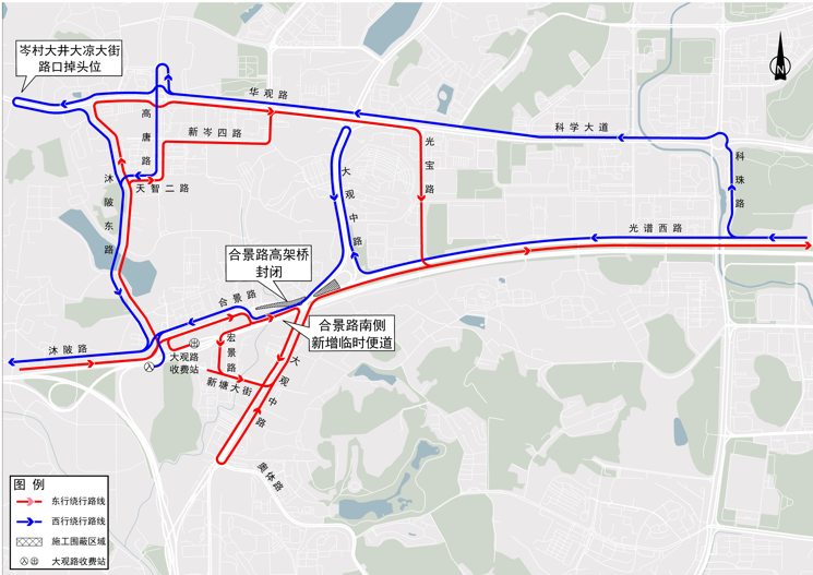 第二阶段:合景路—合景路临时便道—大观中路(南行掉头)—大观中路(北行)—光谱西路北侧右转匝道—光谱西路