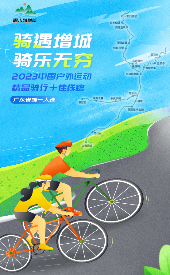 “骑遇增城 骑乐无穷”广州增城绿道骑行路线曾入选“2023中国户外运动精品骑行十佳路线”,为2023年广东省唯一入选路线,路线全长350公里,是南北贯穿、环山绕水的休闲健身绿道网络。