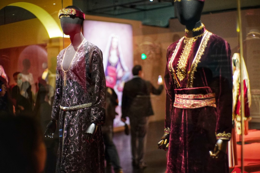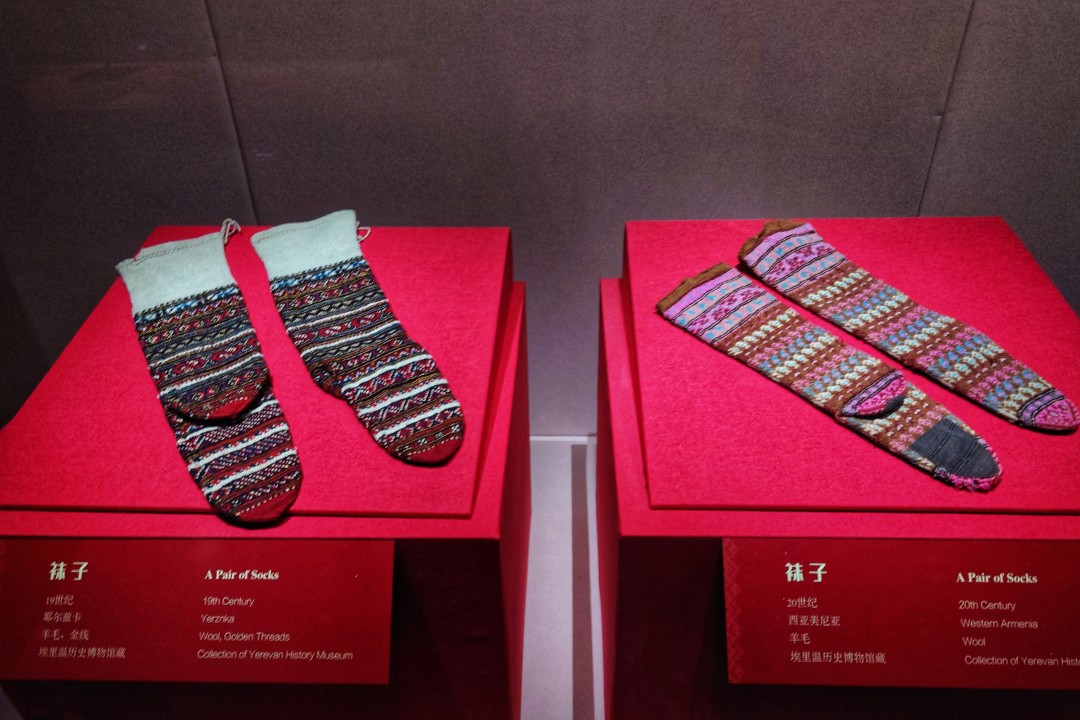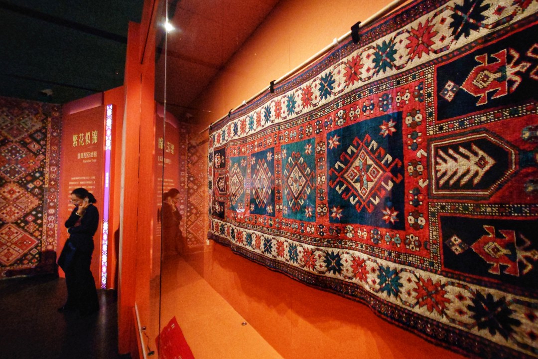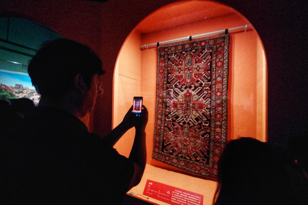 “大美初见——邂逅亚美尼亚”部分展示了亚美尼亚的国家概况及历史沿革,并从语言文字和宗教信仰两个维度揭示了亚美尼亚的国家文化特色。“华冠丽服——亚美尼亚传统服饰”部分展示了亚美尼亚传统服饰塔拉兹(Taraz),并通过东西亚美尼亚服饰的对比展示,呈现了亚美尼亚服饰华丽且独特的文化标志。“银花宝钿——亚美尼亚银器”部分展示了亚美尼亚银器艺术的精湛技艺,从腰带、首饰到餐具多维度展现亚美尼亚银器的独特工艺细节,解读装饰纹样背后的审美与信仰。“繁花似锦——亚美尼亚地毯”部分展示了亚美尼亚古老的地毯编织艺术,从考古发现、制作技艺到地毯的图样,全方位展示了这颗印证亚美尼亚悠久文明的活化石。“和合共生——传承与交汇”部分,展示了亚美尼亚首都埃里温的城市风貌和以活态遗产形式传承的古老文明,并通过探寻亚美尼亚人在中国的足迹,展现不同文明的交流和碰撞。