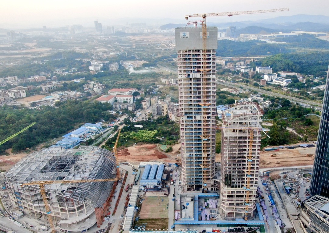 承建单位中建四局华南建设公司介绍,项目总用地面积1.43万平方米,总建筑面积约13.4万平方米,含高、低塔楼各一栋以及商业裙楼、地下车库等。其中,项目低塔楼已于今年7月封顶,建筑高度112米,建筑面积约3.7万平方米,地上23层,设有147间宽敞客房与套房,已引入广州首家悦榕庄酒店,打造多元交互的国际湾区高端酒店。项目高塔楼建筑高度为192米,地上41层,建筑面积5.6万平方米,定位为超甲级写字楼,将打造以智能制造、人工智能等高新科技产业为重点的跨国公司地区性总部,建设粤澳高校知识城创新创业联盟和联合孵化器,进一步放大国际文化艺术和科技创新的叠加效应,助力广州高质量发展。