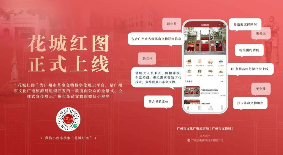 “花城红图”是一款面向公众的全景式、立体式宣传展示广州市革命文物的微信小程序,共收录222处广州市不可移动革命文物的图文简介,并集成了红色游径指南、云上参观、地图导航、参观预约等多项功能。作为广州红色文化数字化展示平台的核心,“花城红图”结合先进的数字化技术,首批集成了广州市15处全国重点文物保护单位(不可移动革命文物)的360°全景漫游功能和实景三维模型,建立了规范的革命文物数字化基础档案体系。用户只需在小程序中搜索“花城红图”,即可一键开启红色广州之旅,实现多维度、沉浸式的游览体验,与鲜活的历史时空“零距离”接触。目前,第二批18处省级文物保护单位也即将上线。