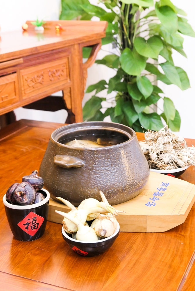 在大石经营了28年的红棉饭店,在街坊心目中有不少招牌菜,烧鹅、白切鸡、柚皮焖鱼肠、脆皮马蹄糕……但最叫人一试难忘,且最具大石特色的,莫过于这款以大石三宝做的“福寿汤”。此汤之所以得名“福寿”,不仅是源于102岁高寿的奶奶所创,更是因为汤料的配方是郭锡文听从身为中医的岳父的建议后加以改良而成的。“一开始,这款汤并没那么多汤料。2018年我参加南粤厨王比赛时,岳父帮我调整了汤料的配方,以达到清热祛湿的功效,无论男女老少四季都啱饮。”