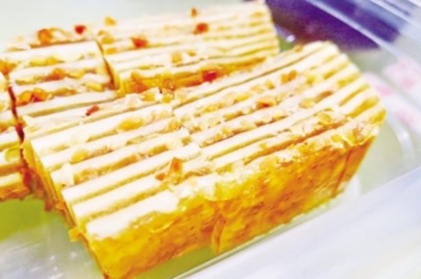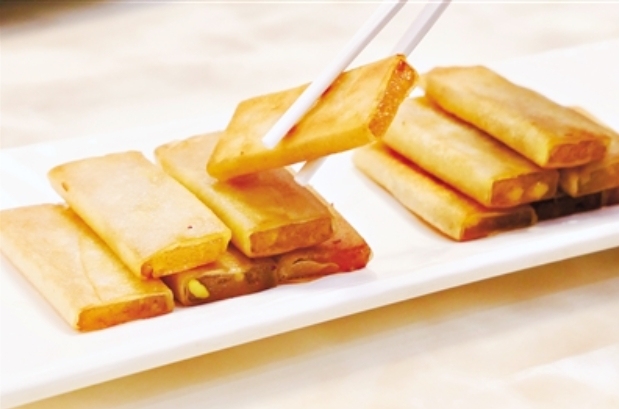 如果说,“福寿汤”里饱含着郭锡文对奶奶的感情,那么“脆皮马蹄糕”则代表了姐弟情谊。郭美玲用姜汁、栗子茸制作的马蹄糕,口味本就别树一格,在此基础上,郭锡文将马蹄糕切成薄片,卷上春卷皮,煎得又香又脆,更是丰富了马蹄糕的口感。这款由姐弟俩合力制作的脆皮马蹄糕,难怪会成为红棉的招牌甜点。