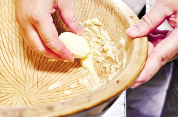 那九爷教的茨菇饼又是如何制作的呢?论方法其实并不复杂——茨菇去皮后,用砂盘擦出粉浆,加入腊肠、腊肉、冬菇、虾米和适量面粉,和匀后煎香即可。然而真正做起来会发现,个中功夫活其实一点也不少。“茨菇的粉浆只能用手磨,机器无法代替,因为机器搅拌容易出水,磨出来的粉浆口感也没有那么好。第一次做茨菇饼时,还没磨完一斤茨菇,我的手就酸得不行了,累得满头是汗。”