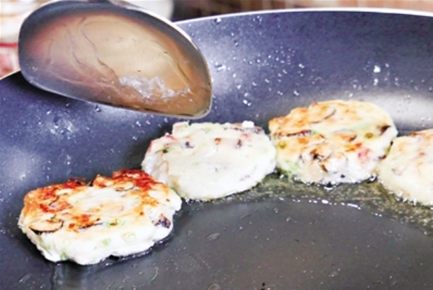 3.将茨菇糊和成团状,烧热油锅,以小火煎香。