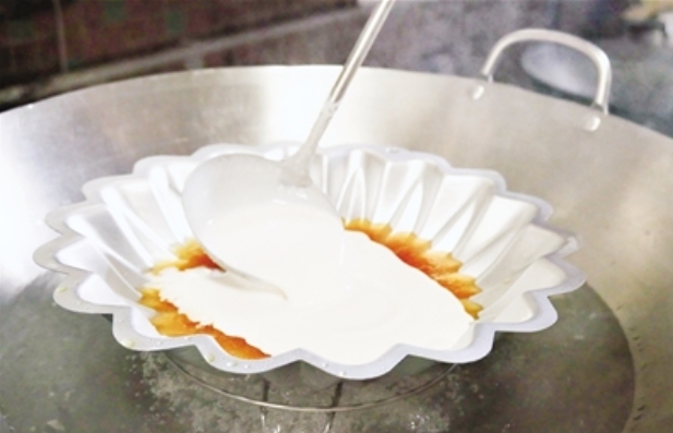 4.蒸锅里的水烧开后,先倒入熟浆,蒸约3分钟,熟透后再淋上生浆,如此叠加9层,耗时约27分钟。
