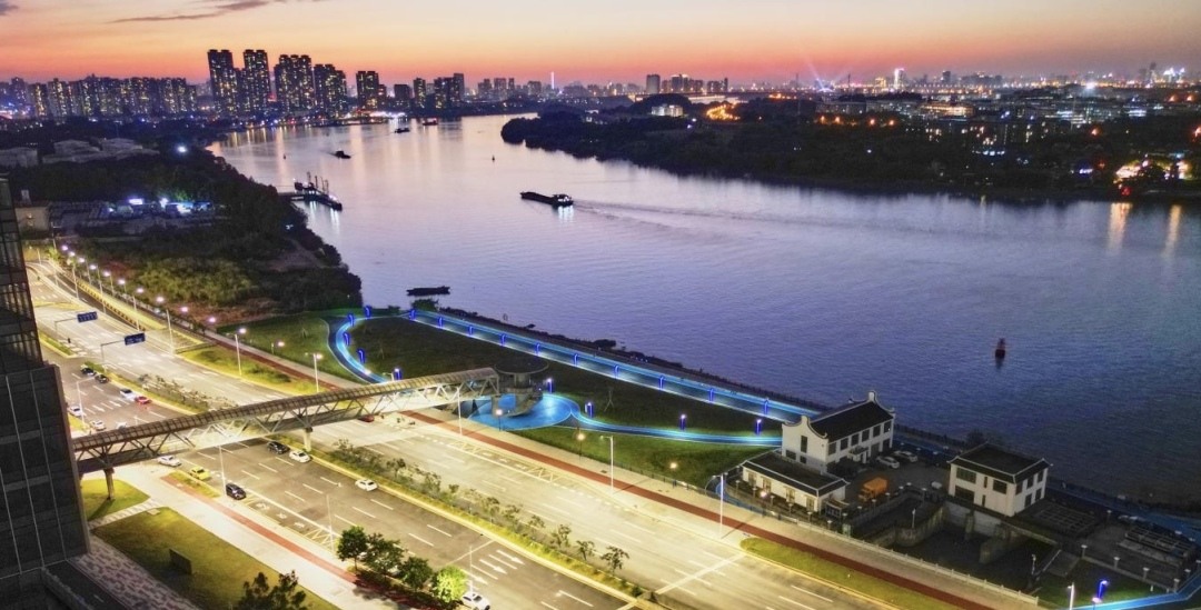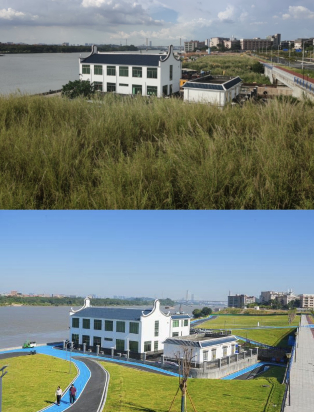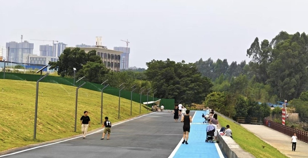 在滨江段,占地3.3万平方米的滨水公园经历了全面升级改造。工程团队通过细致的地表清理、绿地平整,以及铺设沥青硬质地面,并巧妙地将“新造蓝”作为主色调融入其中,精心打造出一条长1公里、宽2米的生态绿道,为市民提供了集休闲与运动于一体的绝佳场所。