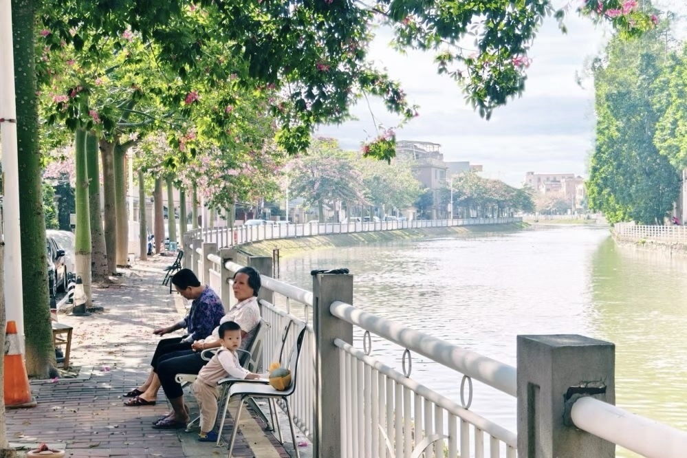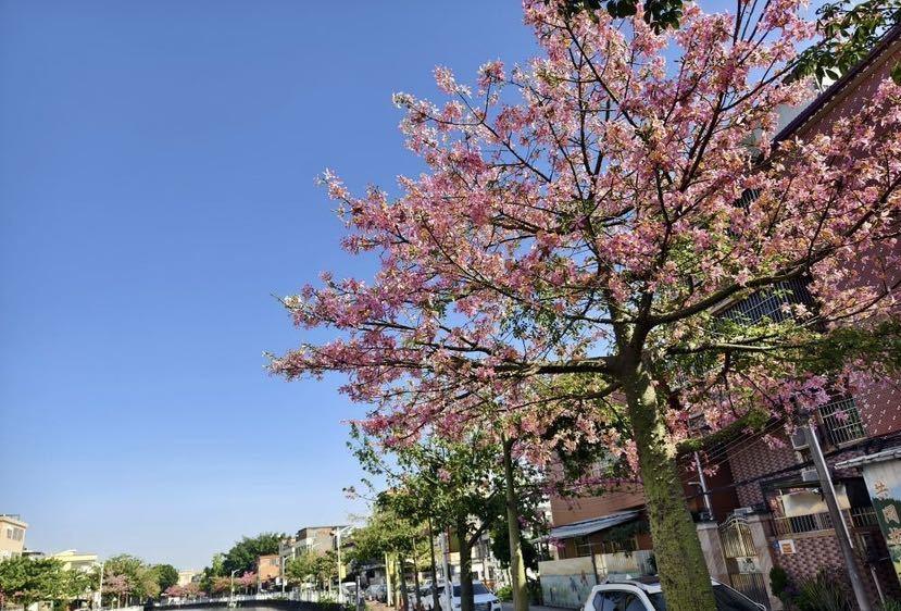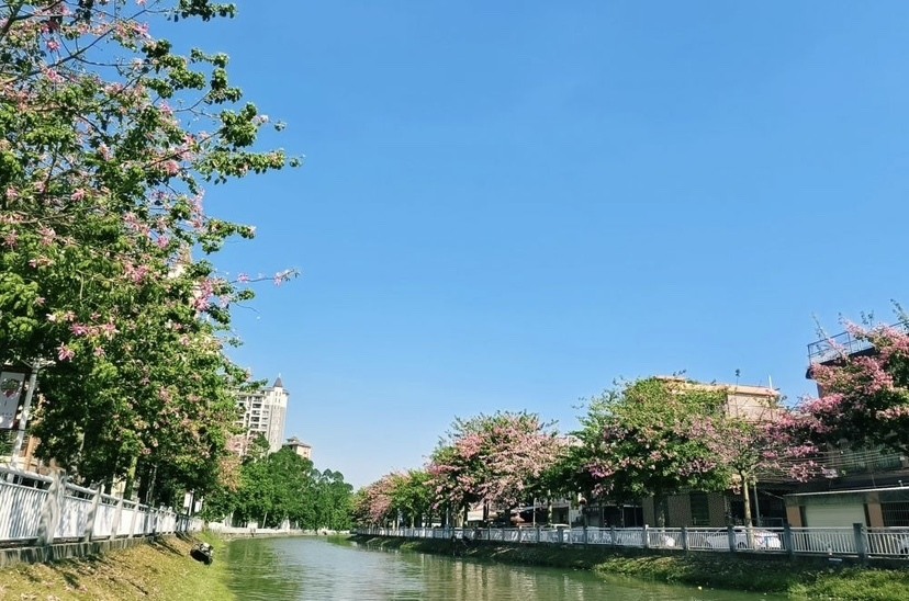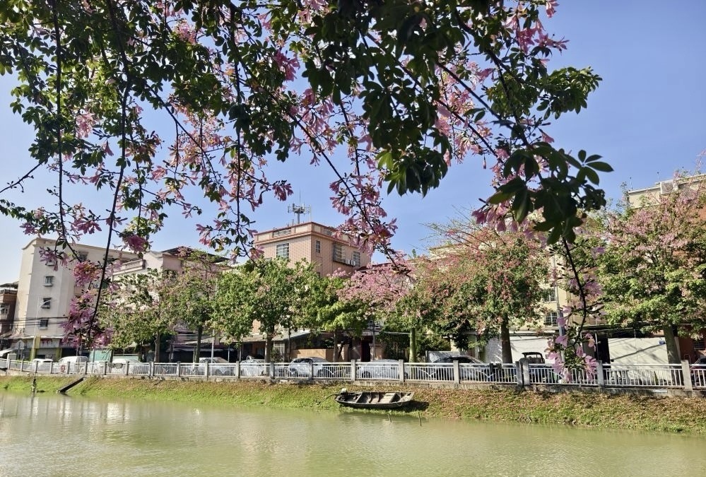 近日,阳光灿烂,天空一片蔚蓝。广州市番禺区雁洲涌(石碁段)碧波荡漾,河涌两岸一株株美丽异木棉花开烂漫,掩映河涌沿线的一栋栋房屋,呈现天蓝水清岸美的岭南水乡风光。