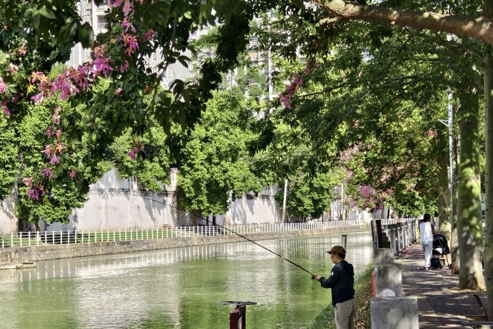 记者来到石碁镇雁洲村的雁洲桥,一树树美丽异木棉花映入眼帘。站在桥头往南和北方向眺望,河涌两岸的美丽异木棉树成行分布,一侧靠近房屋,一侧靠近水岸,伸出的枝干被粉红的花朵染红,满树繁花与周边的房屋、碧波荡漾的水面、蔚蓝的天空构成一幅美丽的风景画。从雁洲涌东岸的兴雁北街、兴雁南街或者从雁洲涌西岸的金雁北街、金雁南街步行,美丽异木棉树上的花朵如同一团团燃烧的火焰,在蓝天的映衬下显得更加鲜艳,微风轻拂,碧波荡漾,让人的心情也更加愉悦。河岸边、花树下,有的居民在钓鱼,有的居民在聊天,悠闲自得。