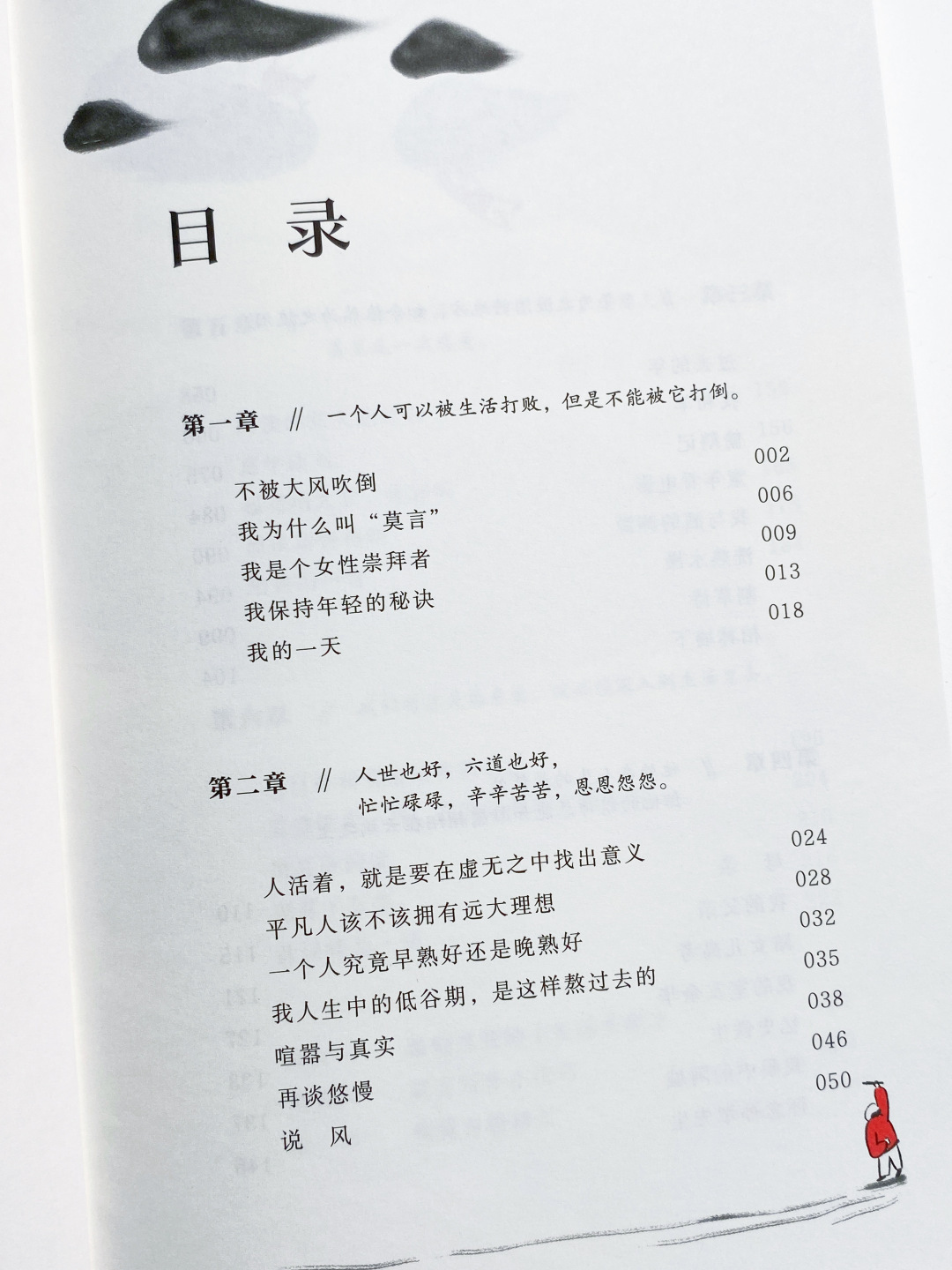 莫言始终相信,越是在困难的时刻,越是文学作品能够发挥它直达心灵的作用的时候。他在这本书里用自己的亲身经历和年近70的人生智慧,传达了一种很有力量的心态——并不是只有奋勇前进才算胜利,踏实扎根在生活的原地,不后退、不堕落、不下沉,不被大风吹倒,本身就是一种前进了。