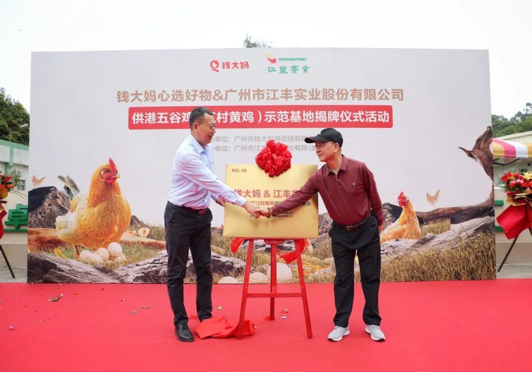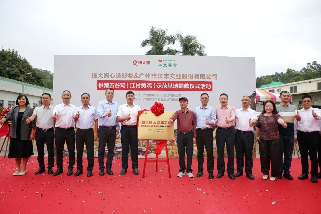 11月14日,钱大妈集团与广州市江丰实业股份有限公司(以下简称“江丰实业”)合作建立的“钱大妈心选好物&江丰实业供港五谷鸡(江村黄鸡)标准养殖示范基地”在广州市白云区江高镇正式揭牌。
