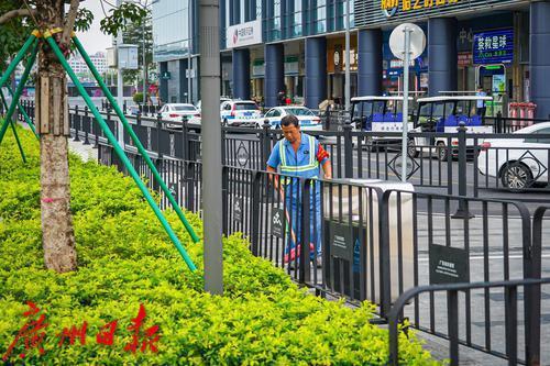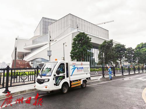 荔湾城管环境卫生管理科副科长赖广进介绍,在艺术中心附近的主次干道上,荔湾城管采用“管家式”服务,从道路清扫、扬尘冲洗、垃圾清运,再到清洗公共设施和人工清洗机械洗刷不到的位置等,全覆盖无死角开展精细化环卫保洁作业。“我们每天安排2辆高压冲洗车、2辆小型扫路车、5辆三轮保洁车和15名工人巡回保洁,通过人机结合模式,对主次干道进行机械化组合深度清洗保洁,并对广场内外的果皮箱等各类设施的灰尘、污垢等进行精细冲、洗、擦,全力守护艺术中心‘美丽容颜’。”赖广进介绍。
