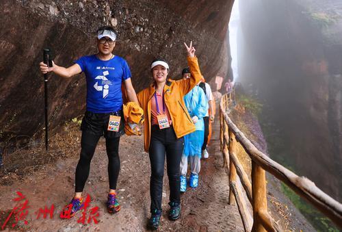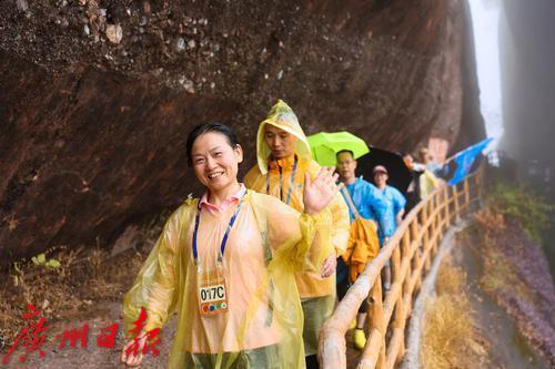 徒步过程中大家冒着小雨穿梭于风景秀丽的丹霞山风景名胜区。