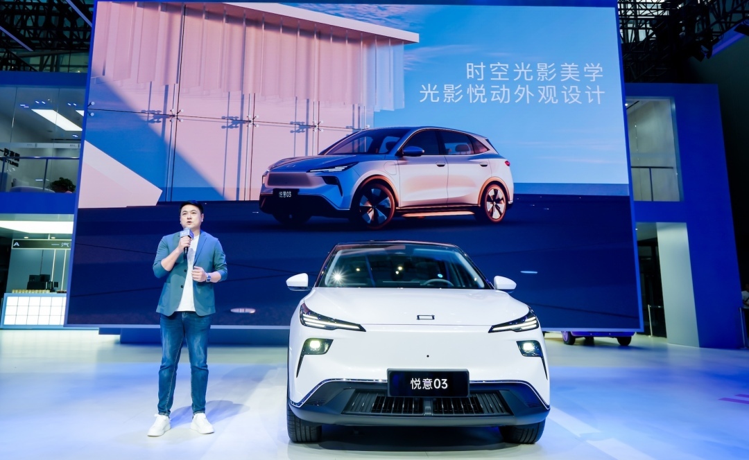 悦意03在设计上采用“时空光影美学”设计理念,拥有0.618黄金轴长比、蝶翼流光前脸、蝶翼光眸前大灯及蝶翼掠影尾灯、光影阶梯前格栅、凌波跃动腰线、星旋流光轮毂等灵动设计,新锐造型实现了设计美学与风阻性能的极限平衡,达成超低风阻系数。