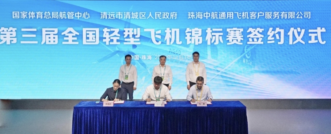 在近日举行的第十五届中国航展期间,国家体育总局、中国航空工业集团通飞客服公司与清城区人民政府就第三届全国轻型飞机锦标赛落地清城区举行签约仪式。